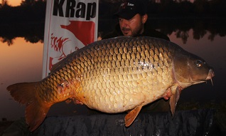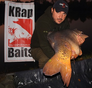 Odata repozitionate toate lansetele , incep sa nadesc cu cobra aproximativ jumatate de kg de boiliesuri tari de 18mm Spicy KRap in zona lansetelor 2 si 3 de la 80m si 5 spomburi cu boiliesuri solubile de 20mm taiate in doua si activate cu lichid nutritiv Spicy KRap. Nici nu termin bine cu nadirea si sunt surprins de un nou run, de data asta la lanseta 3. Putin epuizat de agitatia din ultima ora nu fortez pestele deloc spre minciog simtind ca poate fi un exemplar capital dupa greutatea pe care o simteam cand pompam si faptul ca nu dadea din cap mai deloc dar se apropia fara mare opozitie spre mal. In momentul in care l-am vazut la suprafata m-au trecut fiorii si din a doua incercare reusim sa il punem in mincioc. Merg sa demufez minciogul si constat ca e cel mai mare crap pe care l-am vazut pana acum. Deja eram in extaz, il asezam cu grija in saltea si ducem trepiedul pentru cantarirea monstrului, incredibil, cantarul arata 32,100 kg facem repede operatia de scadere a saltelei si rezulta 30,700 Kg! Pentru moment nu mai aveam aer si nu imi venea sa cred ochilor! Mai punem o data pestele pe cantar, ca sa fim siguri, tot atata! Incredibil! Primul crap de peste 30 kg prins de mine.